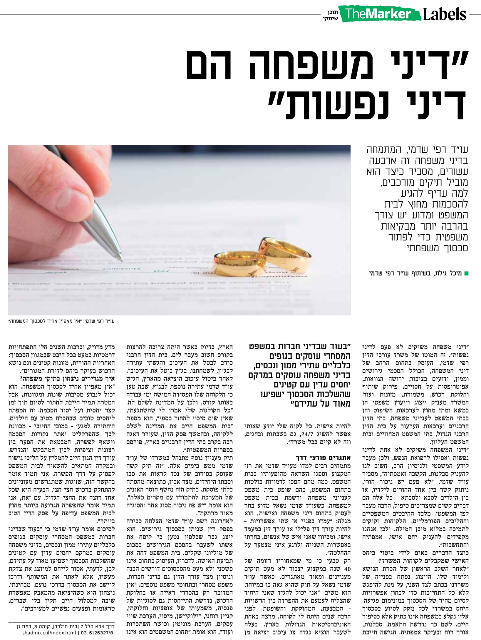 עו"ד רפי שדמי המתמחה בדיני משפחה זה ארבעה עשורים, מסביר לעיתון דה מרקר כיצד הוא מוביל תיקים מורכבים, למה עדיף להגיע להסכמות מחוץ לבית המשפט, אילו התמחויות נוספות מצופות מעו"ד בדיני משפחה וכיצד מגדירים ניצחון בתיק דיני משפחה.